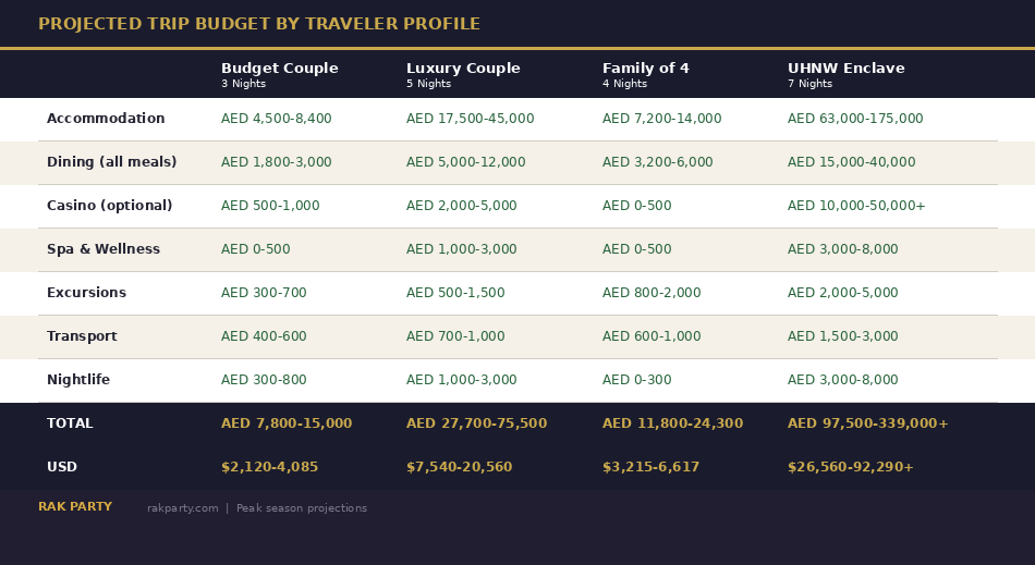 We modelled four complete trips during peak season (October through April, which is when you should visit because the beach, pools, and outdoor dining are actually usable). Summer rates will be 30 to 40 percent lower across the board, but the 42-degree heat with Gulf humidity makes the outdoor premium you are paying for significantly less enjoyable. The best time to visit RAK maps it month by month.