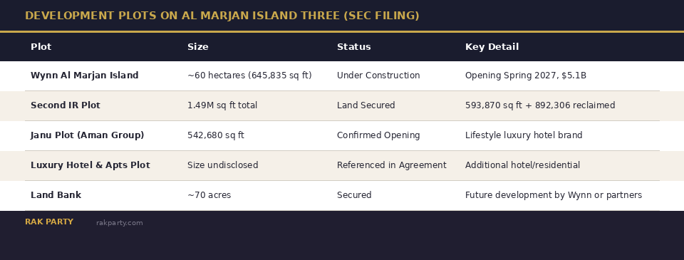 The agreement also references a "Luxury Hotel and Apartments Plot" and a broader "Land Bank." The specifics of these plots are less detailed in the public filings, but their inclusion in the shareholders' agreement signals that Wynn and its partners have mapped out a multi-phase, multi-brand development strategy for Al Marjan Island Three that extends well beyond the current resort.